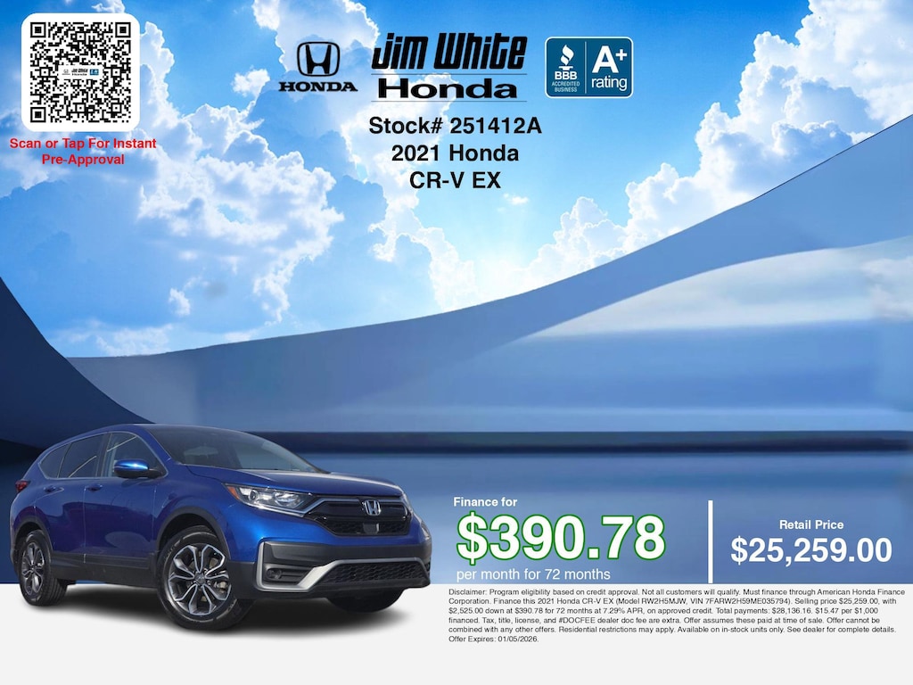 Disclaimer: Disclaimer: Program eligibility based on credit approval. Not all customers will qualify. Must finance through American Honda Finance Corporation. Finance this 2021 Honda CR-V EX (Model RW2H5MJW, VIN 7FARW2H59ME035794). Selling price $25,259.00, with $2,525.00 down at $390.78 for 72 months at 7.29% APR, on approved credit. Total payments: $28,136.16. $15.47 per $1,000 financed. Tax, title, license, and #DOCFEE dealer doc fee are extra. Offer assumes these paid at time of sale. Offer cannot be combined with any other offers. Residential restrictions may apply. Available on in-stock units only. See dealer for complete details. Offer Expires: 01/05/2026.