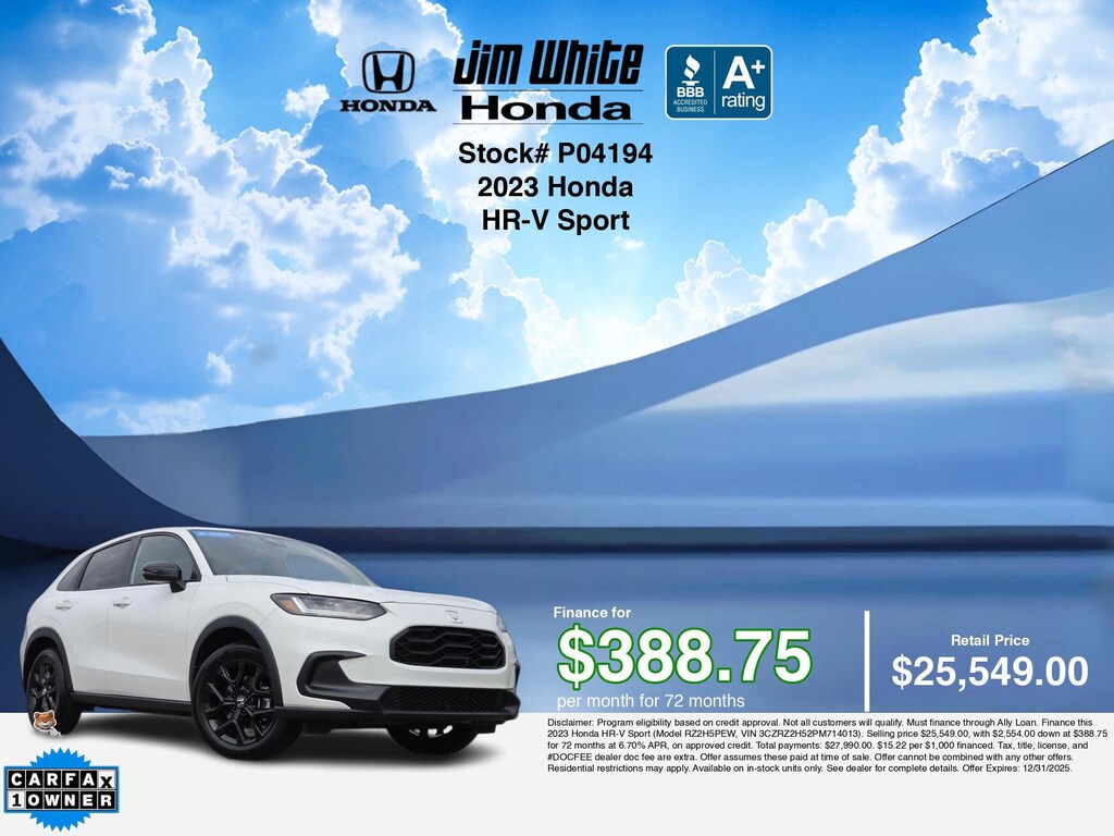 Disclaimer: Disclaimer: Program eligibility based on credit approval. Not all customers will qualify. Must finance through Ally Loan. Finance this 2023 Honda HR-V Sport (Model RZ2H5PEW, VIN 3CZRZ2H52PM714013). Selling price $25,549.00, with $2,554.00 down at $388.75 for 72 months at 6.70% APR, on approved credit. Total payments: $27,990.00. $15.22 per $1,000 financed. Tax, title, license, and #DOCFEE dealer doc fee are extra. Offer assumes these paid at time of sale. Offer cannot be combined with any other offers. Residential restrictions may apply. Available on in-stock units only. See dealer for complete details. Offer Expires: 12/31/2025.