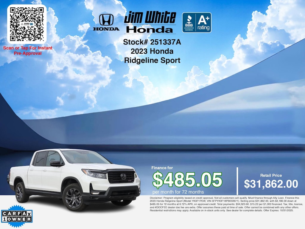 Disclaimer: Disclaimer: Program eligibility based on credit approval. Not all customers will qualify. Must finance through Ally Loan. Finance this 2023 Honda Ridgeline Sport (Model YK3F1PEW, VIN 5FPYK3F18PB059671). Selling price $31,862.00, with $3,186.00 down at $485.05 for 72 months at 6.72% APR, on approved credit. Total payments: $34,923.60. $15.22 per $1,000 financed. Tax, title, license, and #DOCFEE dealer doc fee are extra. Offer assumes these paid at time of sale. Offer cannot be combined with any other offers. Residential restrictions may apply. Available on in-stock units only. See dealer for complete details. Offer Expires: 10/31/2025.