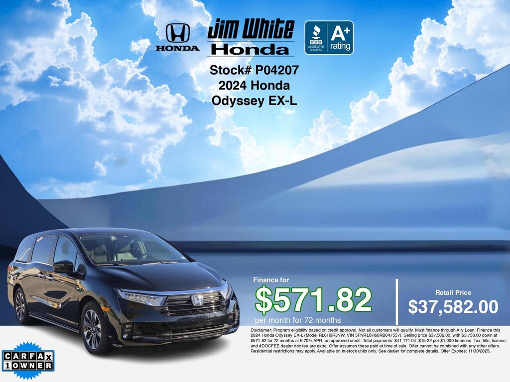 Disclaimer: Disclaimer: Program eligibility based on credit approval. Not all customers will qualify. Must finance through Ally Loan. Finance this 2024 Honda Odyssey EX-L (Model RL6H6RJNW, VIN 5FNRL6H66RB047557). Selling price $37,582.00, with $3,758.00 down at $571.82 for 72 months at 6.70% APR, on approved credit. Total payments: $41,171.04. $15.22 per $1,000 financed. Tax, title, license, and #DOCFEE dealer doc fee are extra. Offer assumes these paid at time of sale. Offer cannot be combined with any other offers. Residential restrictions may apply. Available on in-stock units only. See dealer for complete details. Offer Expires: 11/30/2025.