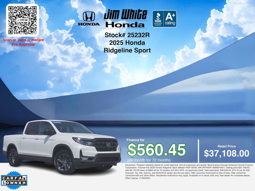 Disclaimer: Disclaimer: Program eligibility based on credit approval. Not all customers will qualify. Must finance through American Honda Finance Corporation. Finance this 2025 Honda Ridgeline Sport (Model YK3F1SEW, VIN 5FPYK3F1XSB001831). Selling price $37,108.00, with $3,710.00 down at $560.45 for 72 months at 6.44% APR, on approved credit. Total payments: $40,352.40. $15.10 per $1,000 financed. Tax, title, license, and #DOCFEE dealer doc fee are extra. Offer assumes these paid at time of sale. Offer cannot be combined with any other offers. Residential restrictions may apply. Available on in-stock units only. See dealer for complete details. Offer Expires: 11/03/2025.