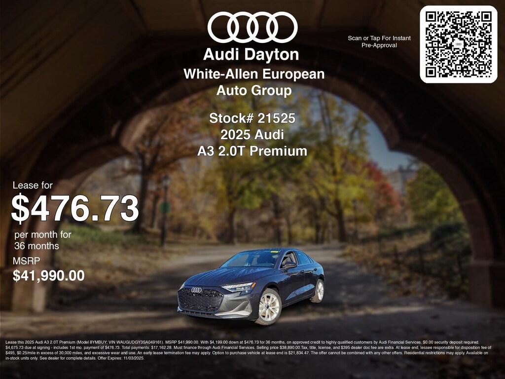 Disclaimer: Lease this 2025 Audi A3 2.0T Premium (Model 8YMBUY; VIN WAUGUDGY3SA049161). MSRP $41,990.00. With $4,199.00 down at $476.73 for 36 months, on approved credit to highly qualified customers by Audi Financial Services. $0.00 security deposit required. $4,675.73 due at signing - includes 1st mo. payment of $476.73. Total payments: $17,162.28. Must finance through Audi Financial Services. Selling price $38,890.00.Tax, title, license, and $395 dealer doc fee are extra. At lease end, lessee responsible for disposition fee of $495, $0.25/mile in excess of 30,000 miles, and excessive wear and use. An early lease termination fee may apply. Option to purchase vehicle at lease end is $21,834.47. The offer cannot be combined with any other offers. Residential restrictions may apply. Available on in-stock units only. See dealer for complete details. Offer Expires: 11/03/2025.