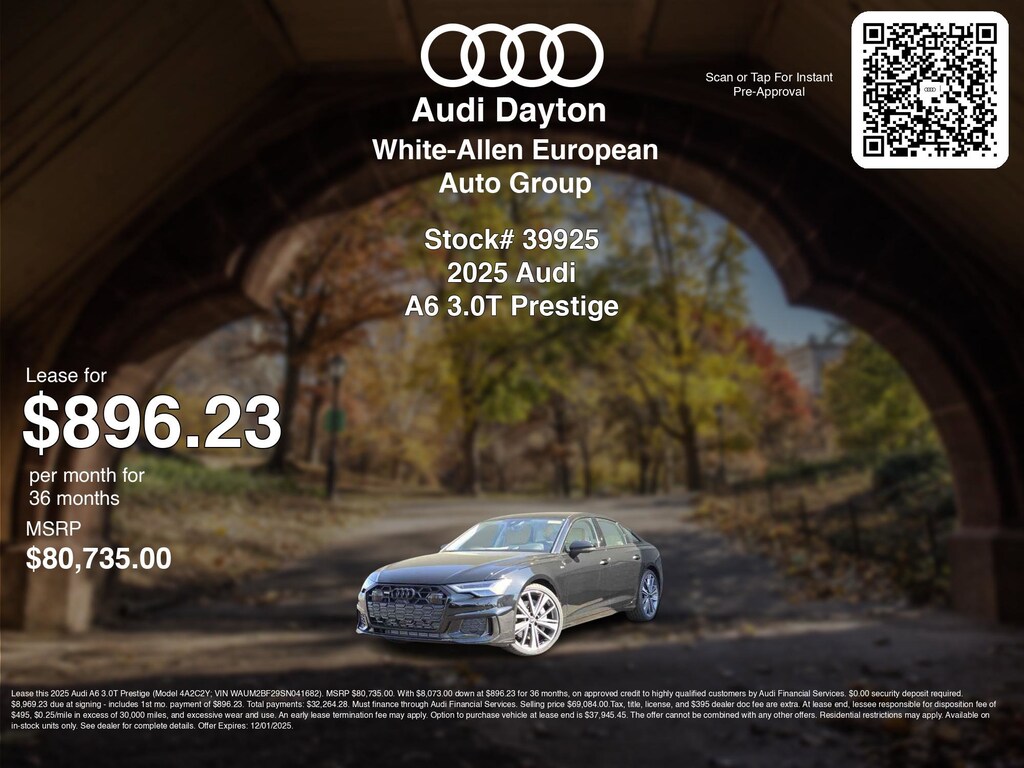 Disclaimer: Lease this 2025 Audi A6 3.0T Prestige (Model 4A2C2Y; VIN WAUM2BF29SN041682). MSRP $80,735.00. With $8,073.00 down at $896.23 for 36 months, on approved credit to highly qualified customers by Audi Financial Services. $0.00 security deposit required. $8,969.23 due at signing - includes 1st mo. payment of $896.23. Total payments: $32,264.28. Must finance through Audi Financial Services. Selling price $69,084.00.Tax, title, license, and $395 dealer doc fee are extra. At lease end, lessee responsible for disposition fee of $495, $0.25/mile in excess of 30,000 miles, and excessive wear and use. An early lease termination fee may apply. Option to purchase vehicle at lease end is $37,945.45. The offer cannot be combined with any other offers. Residential restrictions may apply. Available on in-stock units only. See dealer for complete details. Offer Expires: 12/01/2025.