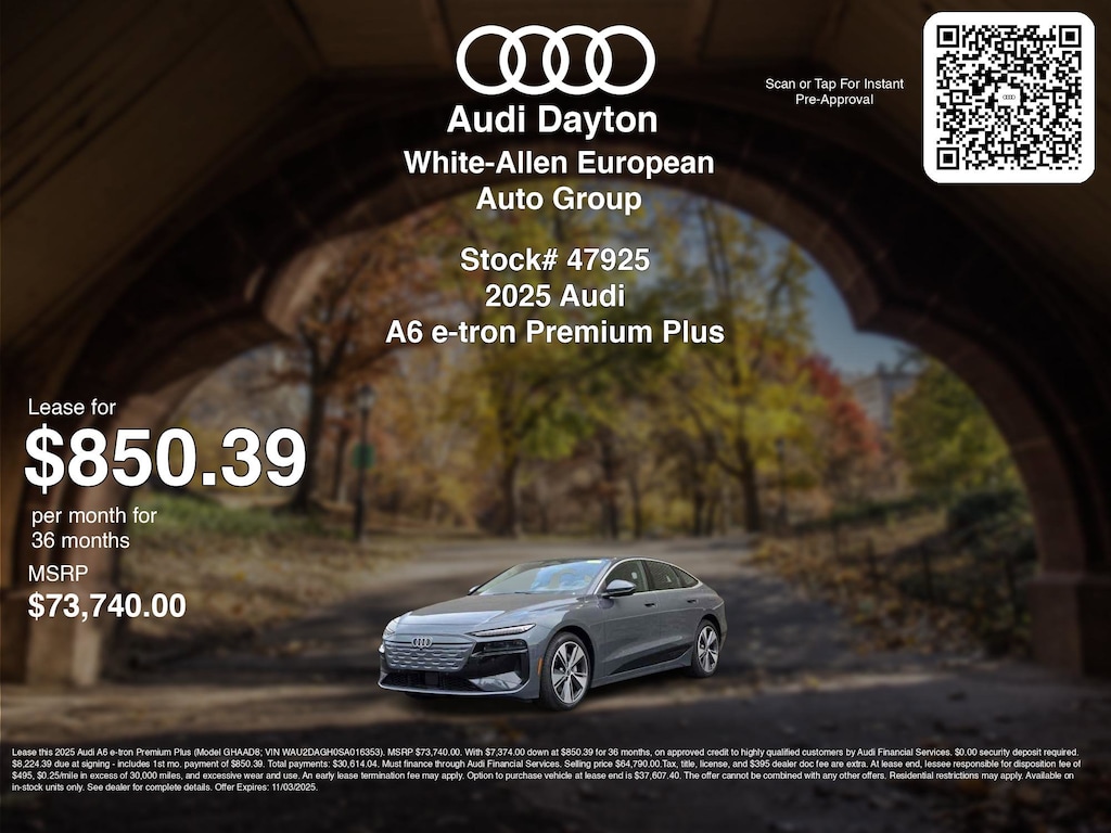Disclaimer: Lease this 2025 Audi A6 e-tron Premium Plus (Model GHAAD8; VIN WAU2DAGH0SA016353). MSRP $73,740.00. With $7,374.00 down at $850.39 for 36 months, on approved credit to highly qualified customers by Audi Financial Services. $0.00 security deposit required. $8,224.39 due at signing - includes 1st mo. payment of $850.39. Total payments: $30,614.04. Must finance through Audi Financial Services. Selling price $64,790.00.Tax, title, license, and $395 dealer doc fee are extra. At lease end, lessee responsible for disposition fee of $495, $0.25/mile in excess of 30,000 miles, and excessive wear and use. An early lease termination fee may apply. Option to purchase vehicle at lease end is $37,607.40. The offer cannot be combined with any other offers. Residential restrictions may apply. Available on in-stock units only. See dealer for complete details. Offer Expires: 11/03/2025.