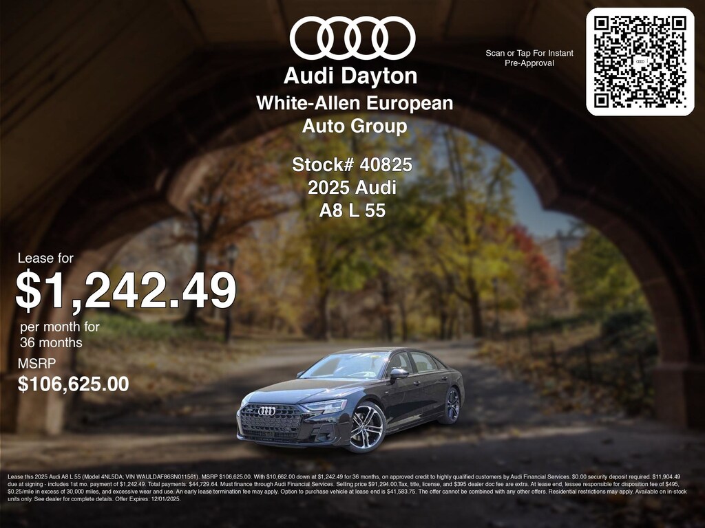 Disclaimer: Lease this 2025 Audi A8 L 55 (Model 4NL5DA; VIN WAULDAF86SN011561). MSRP $106,625.00. With $10,662.00 down at $1,242.49 for 36 months, on approved credit to highly qualified customers by Audi Financial Services. $0.00 security deposit required. $11,904.49 due at signing - includes 1st mo. payment of $1,242.49. Total payments: $44,729.64. Must finance through Audi Financial Services. Selling price $91,294.00.Tax, title, license, and $395 dealer doc fee are extra. At lease end, lessee responsible for disposition fee of $495, $0.25/mile in excess of 30,000 miles, and excessive wear and use. An early lease termination fee may apply. Option to purchase vehicle at lease end is $41,583.75. The offer cannot be combined with any other offers. Residential restrictions may apply. Available on in-stock units only. See dealer for complete details. Offer Expires: 12/01/2025.