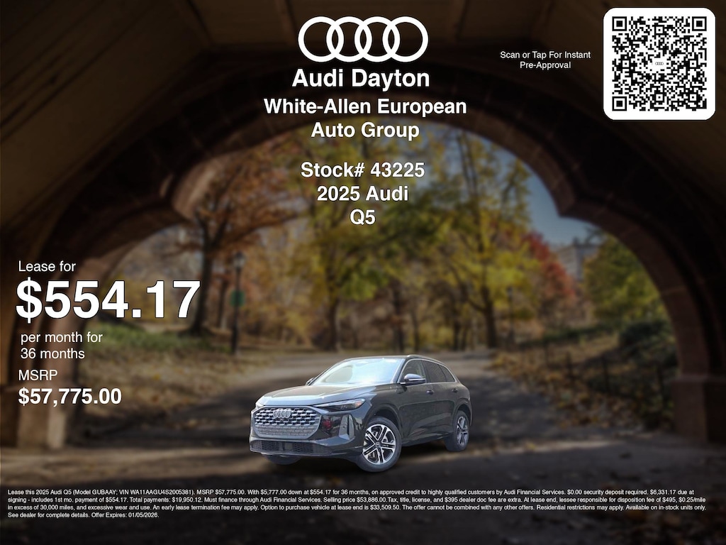 Disclaimer: Lease this 2025 Audi Q5 (Model GUBAAY; VIN WA11AAGU4S2005381). MSRP $57,775.00. With $5,777.00 down at $554.17 for 36 months, on approved credit to highly qualified customers by Audi Financial Services. $0.00 security deposit required. $6,331.17 due at signing - includes 1st mo. payment of $554.17. Total payments: $19,950.12. Must finance through Audi Financial Services. Selling price $53,886.00.Tax, title, license, and $395 dealer doc fee are extra. At lease end, lessee responsible for disposition fee of $495, $0.25/mile in excess of 30,000 miles, and excessive wear and use. An early lease termination fee may apply. Option to purchase vehicle at lease end is $33,509.50. The offer cannot be combined with any other offers. Residential restrictions may apply. Available on in-stock units only. See dealer for complete details. Offer Expires: 01/05/2026.