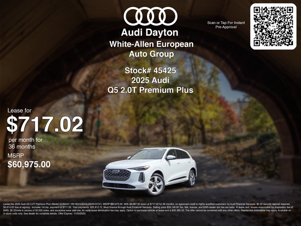 Disclaimer: Lease this 2025 Audi Q5 2.0T Premium Plus (Model GUBAAY; VIN WA12AAGU2S2019137). MSRP $60,975.00. With $6,097.00 down at $717.02 for 36 months, on approved credit to highly qualified customers by Audi Financial Services. $0.00 security deposit required. $6,814.02 due at signing - includes 1st mo. payment of $717.02. Total payments: $25,812.72. Must finance through Audi Financial Services. Selling price $59,146.00.Tax, title, license, and $395 dealer doc fee are extra. At lease end, lessee responsible for disposition fee of $495, $0.25/mile in excess of 30,000 miles, and excessive wear and use. An early lease termination fee may apply. Option to purchase vehicle at lease end is $35,365.50. The offer cannot be combined with any other offers. Residential restrictions may apply. Available on in-stock units only. See dealer for complete details. Offer Expires: 11/03/2025.