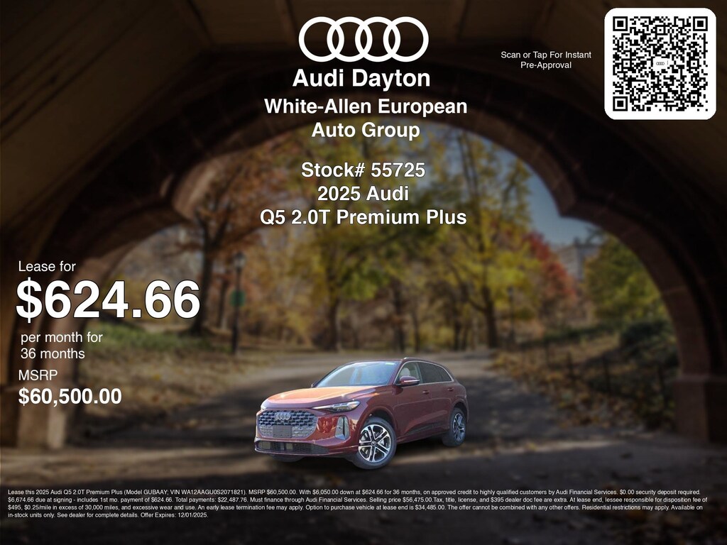 Disclaimer: Lease this 2025 Audi Q5 2.0T Premium Plus (Model GUBAAY; VIN WA12AAGU0S2071821). MSRP $60,500.00. With $6,050.00 down at $624.66 for 36 months, on approved credit to highly qualified customers by Audi Financial Services. $0.00 security deposit required. $6,674.66 due at signing - includes 1st mo. payment of $624.66. Total payments: $22,487.76. Must finance through Audi Financial Services. Selling price $56,475.00.Tax, title, license, and $395 dealer doc fee are extra. At lease end, lessee responsible for disposition fee of $495, $0.25/mile in excess of 30,000 miles, and excessive wear and use. An early lease termination fee may apply. Option to purchase vehicle at lease end is $34,485.00. The offer cannot be combined with any other offers. Residential restrictions may apply. Available on in-stock units only. See dealer for complete details. Offer Expires: 12/01/2025.