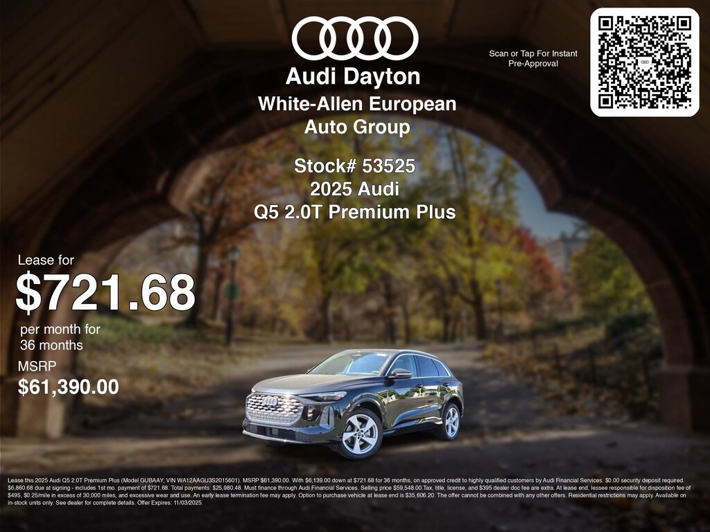 Disclaimer: Lease this 2025 Audi Q5 2.0T Premium Plus (Model GUBAAY; VIN WA12AAGU3S2015601). MSRP $61,390.00. With $6,139.00 down at $721.68 for 36 months, on approved credit to highly qualified customers by Audi Financial Services. $0.00 security deposit required. $6,860.68 due at signing - includes 1st mo. payment of $721.68. Total payments: $25,980.48. Must finance through Audi Financial Services. Selling price $59,548.00.Tax, title, license, and $395 dealer doc fee are extra. At lease end, lessee responsible for disposition fee of $495, $0.25/mile in excess of 30,000 miles, and excessive wear and use. An early lease termination fee may apply. Option to purchase vehicle at lease end is $35,606.20. The offer cannot be combined with any other offers. Residential restrictions may apply. Available on in-stock units only. See dealer for complete details. Offer Expires: 11/03/2025.