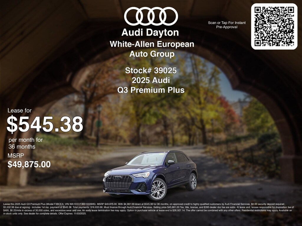 Disclaimer: Lease this 2025 Audi Q3 Premium Plus (Model F3BCEA; VIN WA1EECF39S1033905). MSRP $49,875.00. With $4,987.00 down at $545.38 for 36 months, on approved credit to highly qualified customers by Audi Financial Services. $0.00 security deposit required. $5,532.38 due at signing - includes 1st mo. payment of $545.38. Total payments: $19,633.68. Must finance through Audi Financial Services. Selling price $45,881.00.Tax, title, license, and $395 dealer doc fee are extra. At lease end, lessee responsible for disposition fee of $495, $0.25/mile in excess of 30,000 miles, and excessive wear and use. An early lease termination fee may apply. Option to purchase vehicle at lease end is $28,927.14. The offer cannot be combined with any other offers. Residential restrictions may apply. Available on in-stock units only. See dealer for complete details. Offer Expires: 11/03/2025.