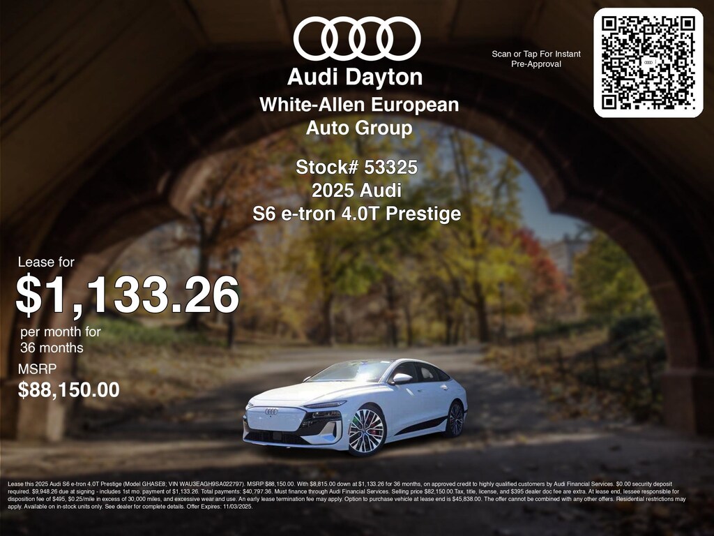 Disclaimer: Lease this 2025 Audi S6 e-tron 4.0T Prestige (Model GHASE8; VIN WAU3EAGH9SA022797). MSRP $88,150.00. With $8,815.00 down at $1,133.26 for 36 months, on approved credit to highly qualified customers by Audi Financial Services. $0.00 security deposit required. $9,948.26 due at signing - includes 1st mo. payment of $1,133.26. Total payments: $40,797.36. Must finance through Audi Financial Services. Selling price $82,150.00.Tax, title, license, and $395 dealer doc fee are extra. At lease end, lessee responsible for disposition fee of $495, $0.25/mile in excess of 30,000 miles, and excessive wear and use. An early lease termination fee may apply. Option to purchase vehicle at lease end is $45,838.00. The offer cannot be combined with any other offers. Residential restrictions may apply. Available on in-stock units only. See dealer for complete details. Offer Expires: 11/03/2025.