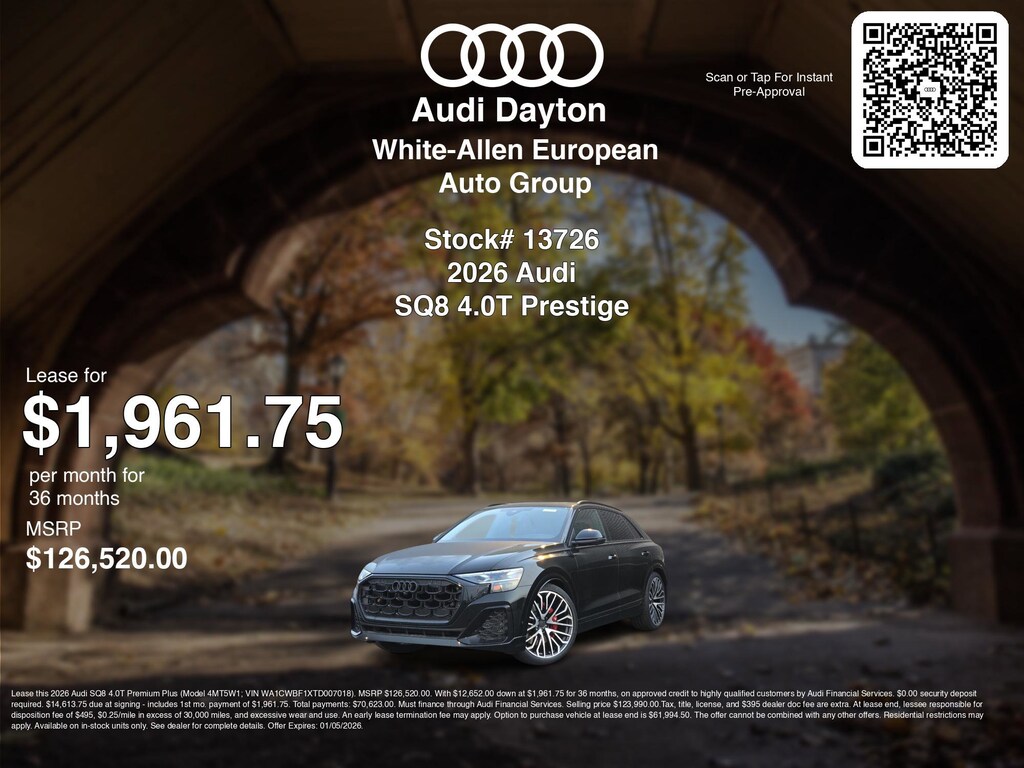 If you're ready to lease a new Audi vehicle near Dayton, Kettering, Beavercreek, and Fairborn, White Allen Audi of Dayton is thrilled to offer you a competitive lease offer on this 2026 Audi SQ8 4.0T Prestige. Hereâs how the monthly payment of $1,961.75 is calculated for well qualified buyers shopping White Allen Audi of Dayton with Tier 1 credit: