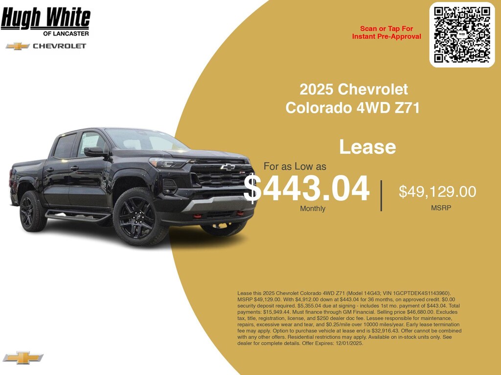 Our GM lease offers combine GM Financial benefits with current Chevrolet Colorado 4WD Z71 incentives. PLUS, explore 3 more Colorado 4WD Z71 options for Lancasterâs best selection. Hurry these GM lease specials end 12/1/2025. Lease this 2025 Chevrolet Colorado 4WD Z71 (Model 14G43; VIN 1GCPTDEK4S1143960). MSRP $49,129.00. With $4,912.00 down at $443.04 for 36 months, on approved credit. $0.00 security deposit required. $5,355.04 due at signing - includes 1st mo. payment of $443.04. Total payments: $15,949.44. Must finance through GM Financial. Selling price $46,680.00. Excludes tax, title, registration, license, and $250 dealer doc fee. Lessee responsible for maintenance, repairs, excessive wear and tear, and $0.25/mile over 10000 miles/year. Early lease termination fee may apply. Option to purchase vehicle at lease end is $32,916.43. Offer cannot be combined with any other offers. Residential restrictions may apply. Available on in-stock units only. See dealer for complete details. Offer Expires: 12/01/2025.