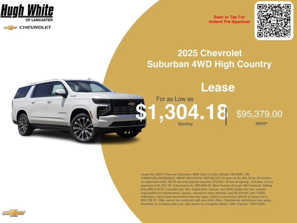 Our GM lease offers combine GM Financial benefits with current Chevrolet Suburban 4WD High Country incentives. PLUS, explore 1 more Suburban 4WD High Country options for Lancasterâs best selection. Hurry these GM lease specials end 12/1/2025. Lease this 2025 Chevrolet Suburban 4WD High Country (Model CK10906; VIN 1GNS6GRL4SR383024). MSRP $95,379.00. With $9,537.00 down at $1,304.18 for 39 months, on approved credit. $0.00 security deposit required. $10,841.18 due at signing - includes 1st mo. payment of $1,304.18. Total payments: $50,863.02. Must finance through GM Financial. Selling price $92,518.00. Excludes tax, title, registration, license, and $250 dealer doc fee. Lessee responsible for maintenance, repairs, excessive wear and tear, and $0.25/mile over 10000 miles/year. Early lease termination fee may apply. Option to purchase vehicle at lease end is $46,738.47. Offer cannot be combined with any other offers. Residential restrictions may apply. Available on in-stock units only. See dealer for complete details. Offer Expires: 12/01/2025.