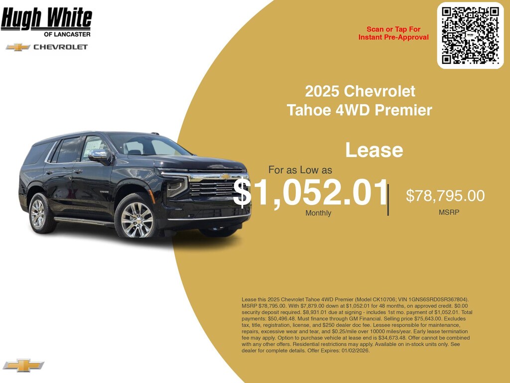 Our GM lease offers combine GM Financial benefits with current Chevrolet Tahoe 4WD Premier incentives. PLUS, explore 5 more Tahoe 4WD Premier options for Lancasterâs best selection. Hurry these GM lease specials end 1/2/2026. Lease this 2025 Chevrolet Tahoe 4WD Premier (Model CK10706; VIN 1GNS6SRD0SR367804). MSRP $78,795.00. With $7,879.00 down at $1,052.01 for 48 months, on approved credit. $0.00 security deposit required. $8,931.01 due at signing - includes 1st mo. payment of $1,052.01. Total payments: $50,496.48. Must finance through GM Financial. Selling price $75,643.00. Excludes tax, title, registration, license, and $250 dealer doc fee. Lessee responsible for maintenance, repairs, excessive wear and tear, and $0.25/mile over 10000 miles/year. Early lease termination fee may apply. Option to purchase vehicle at lease end is $34,673.48. Offer cannot be combined with any other offers. Residential restrictions may apply. Available on in-stock units only. See dealer for complete details. Offer Expires: 01/02/2026.