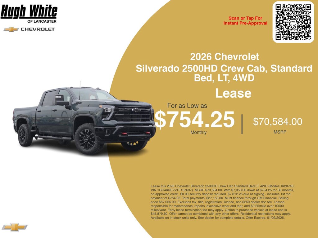 Take advantage of GM Financial programs and Chevrolet Silverado 2500HD Crew Cab, Standard Bed, LT, 4WD incentives today. PLUS, choose from 5 more Silverado 2500HD Crew Cab, Standard Bed, LT, 4WD options for Lancasterâs best lineup. Finance specials end 12/31/2025. Disclaimer: Finance this 2026 Chevrolet Silverado 2500HD Crew Cab Standard Bed LT 4WD (Model CK20743, VIN 1GC4KNE72TF167637). MSRP $70,584.00. Selling price $66,055.00, with $7,058.00 down at $974.41 for 72 months at 5.88% APR, on approved credit. Total payments: $70,157.52. Must finance through Ally Loan. $14.75 per $1,000 financed. Excludes tax, title, registration, license, and $250 dealer doc fee. Offer cannot be combined with any other offers. Residential restrictions may apply. Available on in-stock units only. See dealer for complete details. Offer Expires: 12/31/2025.