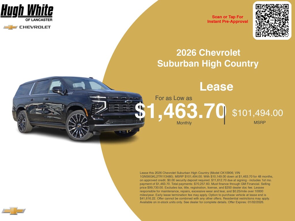 Our GM lease offers combine GM Financial benefits with current Chevrolet Suburban High Country incentives. PLUS, explore 1 more Suburban High Country options for Lancasterâs best selection. Hurry these GM lease specials end 1/2/2026. Lease this 2026 Chevrolet Suburban High Country (Model CK10906; VIN 1GNS6GKL2TR113480). MSRP $101,494.00. With $10,149.00 down at $1,463.70 for 48 months, on approved credit. $0.00 security deposit required. $11,612.70 due at signing - includes 1st mo. payment of $1,463.70. Total payments: $70,257.60. Must finance through GM Financial. Selling price $99,730.00. Excludes tax, title, registration, license, and $250 dealer doc fee. Lessee responsible for maintenance, repairs, excessive wear and tear, and $0.25/mile over 10000 miles/year. Early lease termination fee may apply. Option to purchase vehicle at lease end is $41,616.22. Offer cannot be combined with any other offers. Residential restrictions may apply. Available on in-stock units only. See dealer for complete details. Offer Expires: 01/02/2026.