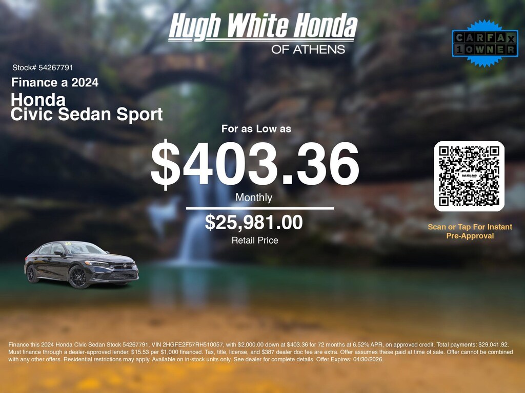 If you're ready to finance a quality used vehicle near Athens, Nelsonville, Logan, and Parkersburg, Hugh White Honda of Athens is thrilled to offer you a competitive finance offer on this 2024 Honda Civic Sedan Sport. Use our car payment calculator to estimate your monthly payments or see how the monthly payment of $403.36 is calculated for well-qualified buyers shopping at Hugh White Honda of Athens with Tier 1 credit: