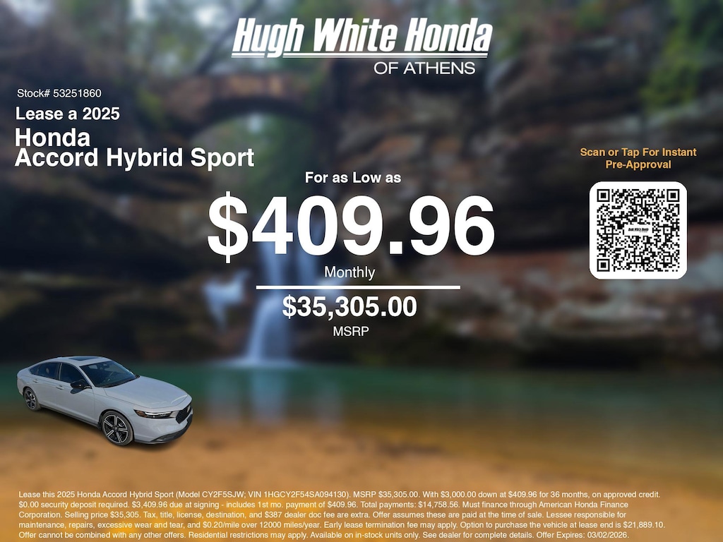 Disclaimer: Lease this 2025 Honda Accord Hybrid Sport (Model CY2F5SJW; VIN 1HGCY2F54SA094130). MSRP $35,305.00. With $3,000.00 down at $409.96 for 36 months, on approved credit. $0.00 security deposit required. $3,409.96 due at signing - includes 1st mo. payment of $409.96. Total payments: $14,758.56. Must finance through American Honda Finance Corporation. Selling price $35,305. Tax, title, license, destination, and $387 dealer doc fee are extra. Offer assumes these are paid at the time of sale. Lessee responsible for maintenance, repairs, excessive wear and tear, and $0.20/mile over 12000 miles/year. Early lease termination fee may apply. Option to purchase the vehicle at lease end is $21,889.10. Offer cannot be combined with any other offers. Residential restrictions may apply. Available on in-stock units only. See dealer for complete details. Offer Expires: 03/02/2026.