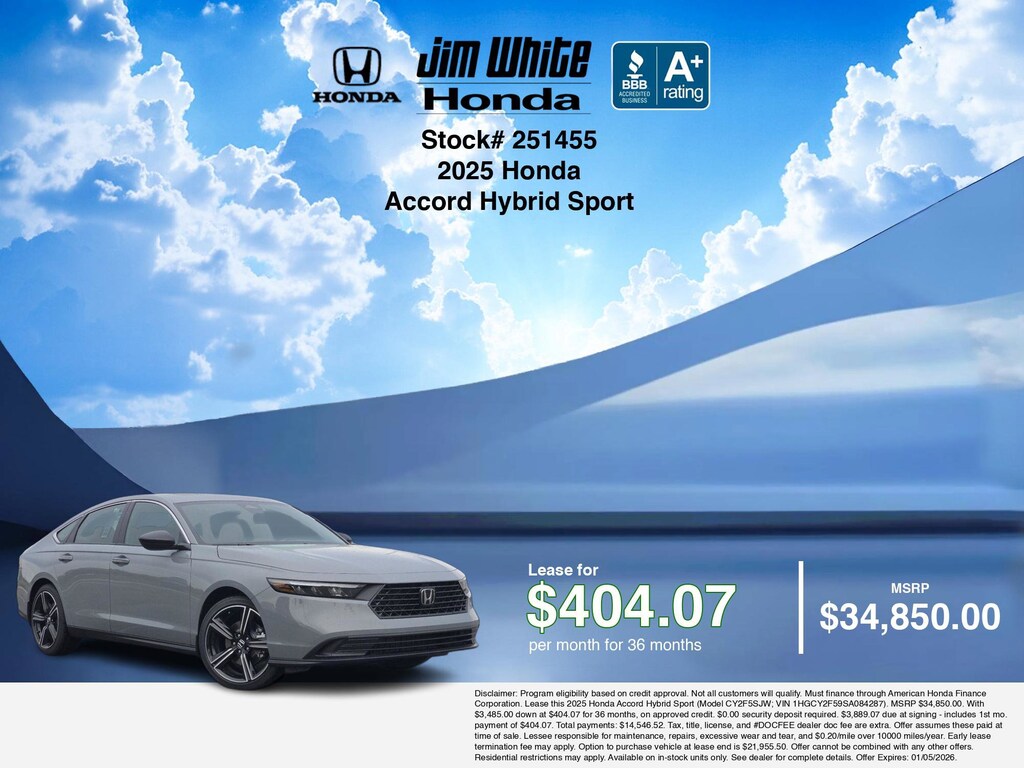 These offers leverage the benefits of Honda Financial Services, along with current Honda incentives, Honda Accord Hybrid Sport specials, and tax incentives available on electric vehicles. Additionally, we offer 5 other Accord Hybrid Sport options for the best selection in Maumee. Call or drive in for competitive Honda lease offers you can drive home today, like this stunning 2025 Honda Accord Hybrid with lease options near Maumee! This Accord Hybrid is also available for sale near Toledo, Perrysburg, and Waterville. These Honda lease specials end 1/5/2026 Disclaimer: Disclaimer: Program eligibility based on credit approval. Not all customers will qualify. Must finance through American Honda Finance Corporation. Lease this 2025 Honda Accord Hybrid Sport (Model CY2F5SJW; VIN 1HGCY2F59SA084287). MSRP $34,850.00. With $3,485.00 down at $404.07 for 36 months, on approved credit. $0.00 security deposit required. $3,889.07 due at signing - includes 1st mo. payment of $404.07. Total payments: $14,546.52. Tax, title, license, and #DOCFEE dealer doc fee are extra. Offer assumes these paid at time of sale. Lessee responsible for maintenance, repairs, excessive wear and tear, and $0.20/mile over 10000 miles/year. Early lease termination fee may apply. Option to purchase vehicle at lease end is $21,955.50. Offer cannot be combined with any other offers. Residential restrictions may apply. Available on in-stock units only. See dealer for complete details. Offer Expires: 01/05/2026.
