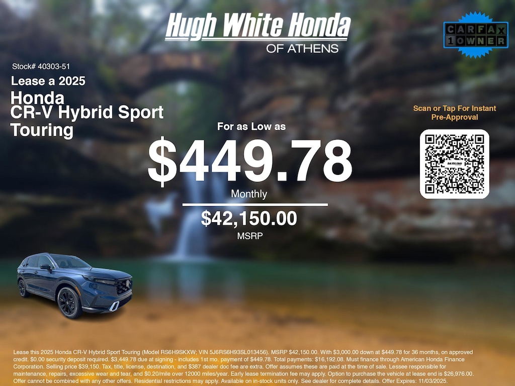 If you're ready to lease a new Honda near Athens, Nelsonville, Logan, and Parkersburg, Hugh White Honda of Athens is thrilled to offer you a competitive lease offer on this 2025 Honda CR-V Hybrid Sport Touring. Here is how the monthly payment of $449.78 is calculated for well qualified buyers shopping Hugh White Honda of Athens with Tier 1 credit:
