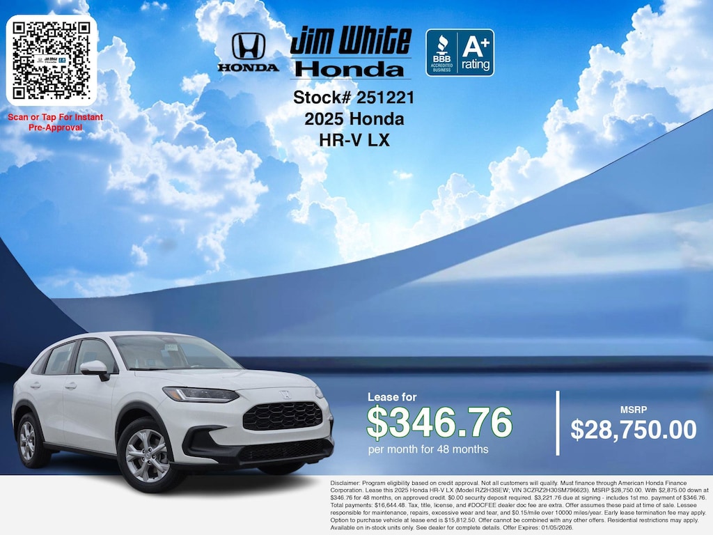 These offers leverage the benefits of Honda Financial Services, along with current Honda incentives, Honda HR-V LX specials, and tax incentives available on electric vehicles. Additionally, we offer 11 other HR-V LX options for the best selection in Maumee. Call or drive in for competitive Honda lease offers you can drive home today, like this stunning 2025 Honda HR-V with lease options near Maumee! This HR-V is also available for sale near Toledo, Perrysburg, and Waterville. These Honda lease specials end 1/5/2026 Disclaimer: Disclaimer: Program eligibility based on credit approval. Not all customers will qualify. Must finance through American Honda Finance Corporation. Lease this 2025 Honda HR-V LX (Model RZ2H3SEW; VIN 3CZRZ2H30SM796623). MSRP $28,750.00. With $2,875.00 down at $346.76 for 48 months, on approved credit. $0.00 security deposit required. $3,221.76 due at signing - includes 1st mo. payment of $346.76. Total payments: $16,644.48. Tax, title, license, and #DOCFEE dealer doc fee are extra. Offer assumes these paid at time of sale. Lessee responsible for maintenance, repairs, excessive wear and tear, and $0.15/mile over 10000 miles/year. Early lease termination fee may apply. Option to purchase vehicle at lease end is $15,812.50. Offer cannot be combined with any other offers. Residential restrictions may apply. Available on in-stock units only. See dealer for complete details. Offer Expires: 01/05/2026.