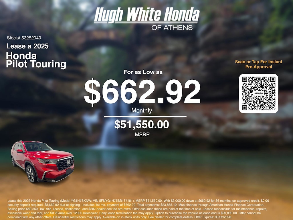 Disclaimer: Lease this 2025 Honda Pilot Touring (Model YG1H7SKNW; VIN 5FNYG1H75SB187181). MSRP $51,550.00. With $3,000.00 down at $662.92 for 36 months, on approved credit. $0.00 security deposit required. $3,662.92 due at signing - includes 1st mo. payment of $662.92. Total payments: $23,865.12. Must finance through American Honda Finance Corporation. Selling price $50,550. Tax, title, license, destination, and $387 dealer doc fee are extra. Offer assumes these are paid at the time of sale. Lessee responsible for maintenance, repairs, excessive wear and tear, and $0.20/mile over 12000 miles/year. Early lease termination fee may apply. Option to purchase the vehicle at lease end is $29,899.00. Offer cannot be combined with any other offers. Residential restrictions may apply. Available on in-stock units only. See dealer for complete details. Offer Expires: 03/02/2026.