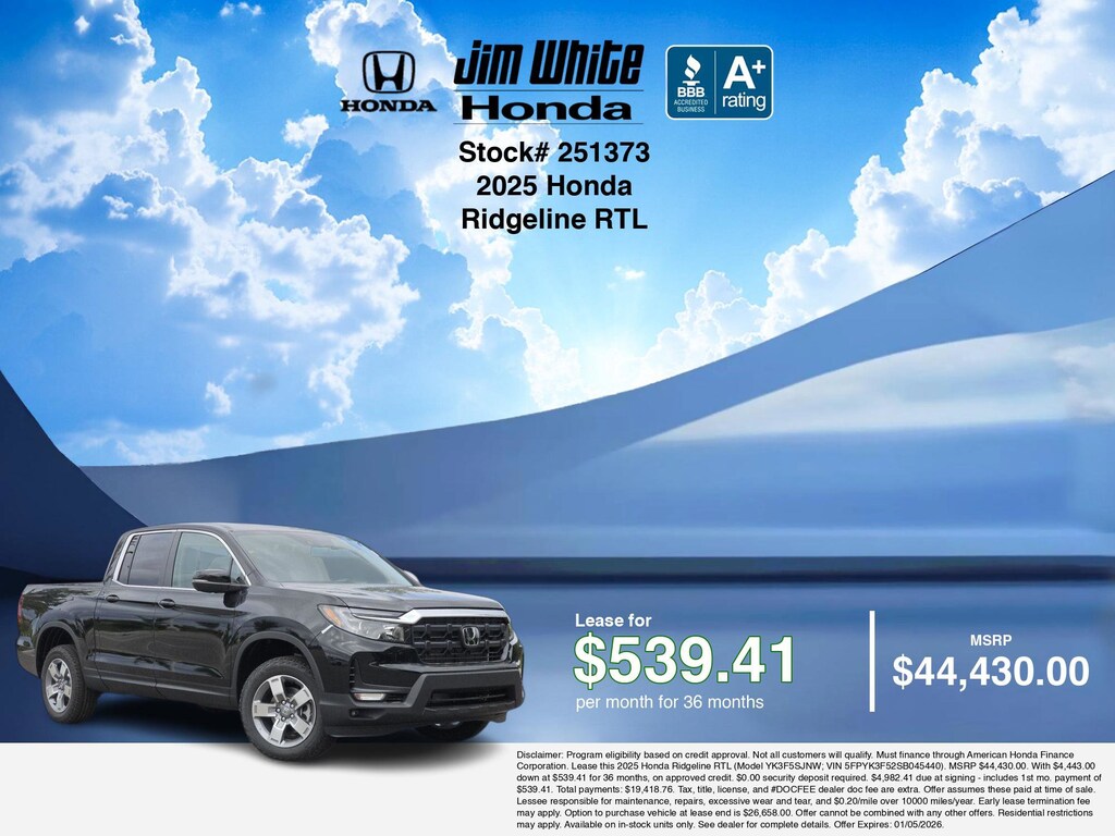 These offers leverage the benefits of Honda Financial Services, along with current Honda incentives, Honda Ridgeline RTL specials, and tax incentives available on electric vehicles. Additionally, we offer 3 other Ridgeline RTL options for the best selection in Maumee. Call or drive in for competitive Honda lease offers you can drive home today, like this stunning 2025 Honda Ridgeline with lease options near Maumee! This Ridgeline is also available for sale near Toledo, Perrysburg, and Waterville. These Honda lease specials end 1/5/2026 Disclaimer: Disclaimer: Program eligibility based on credit approval. Not all customers will qualify. Must finance through American Honda Finance Corporation. Lease this 2025 Honda Ridgeline RTL (Model YK3F5SJNW; VIN 5FPYK3F52SB045440). MSRP $44,430.00. With $4,443.00 down at $539.41 for 36 months, on approved credit. $0.00 security deposit required. $4,982.41 due at signing - includes 1st mo. payment of $539.41. Total payments: $19,418.76. Tax, title, license, and #DOCFEE dealer doc fee are extra. Offer assumes these paid at time of sale. Lessee responsible for maintenance, repairs, excessive wear and tear, and $0.20/mile over 10000 miles/year. Early lease termination fee may apply. Option to purchase vehicle at lease end is $26,658.00. Offer cannot be combined with any other offers. Residential restrictions may apply. Available on in-stock units only. See dealer for complete details. Offer Expires: 01/05/2026.