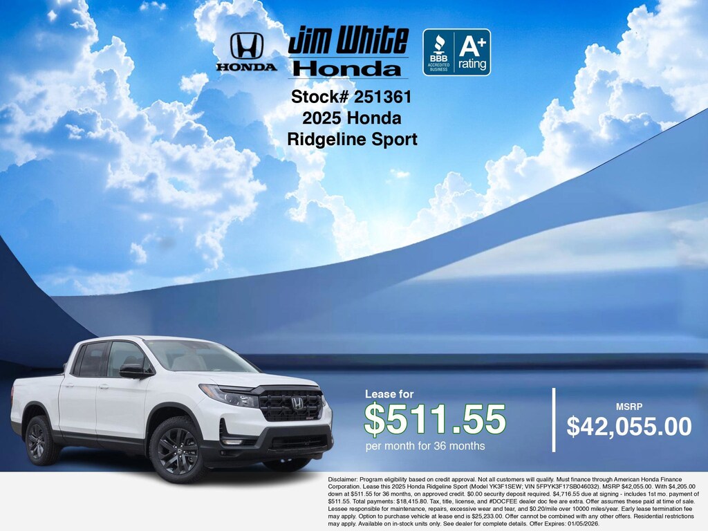 These offers leverage the benefits of Honda Financial Services, along with current Honda incentives, Honda Ridgeline Sport specials, and tax incentives available on electric vehicles. Additionally, we offer 4 other Ridgeline Sport options for the best selection in Maumee. Call or drive in for competitive Honda lease offers you can drive home today, like this stunning 2025 Honda Ridgeline with lease options near Maumee! This Ridgeline is also available for sale near Toledo, Perrysburg, and Waterville. These Honda lease specials end 1/5/2026 Disclaimer: Disclaimer: Program eligibility based on credit approval. Not all customers will qualify. Must finance through American Honda Finance Corporation. Lease this 2025 Honda Ridgeline Sport (Model YK3F1SEW; VIN 5FPYK3F17SB046032). MSRP $42,055.00. With $4,205.00 down at $511.55 for 36 months, on approved credit. $0.00 security deposit required. $4,716.55 due at signing - includes 1st mo. payment of $511.55. Total payments: $18,415.80. Tax, title, license, and #DOCFEE dealer doc fee are extra. Offer assumes these paid at time of sale. Lessee responsible for maintenance, repairs, excessive wear and tear, and $0.20/mile over 10000 miles/year. Early lease termination fee may apply. Option to purchase vehicle at lease end is $25,233.00. Offer cannot be combined with any other offers. Residential restrictions may apply. Available on in-stock units only. See dealer for complete details. Offer Expires: 01/05/2026.