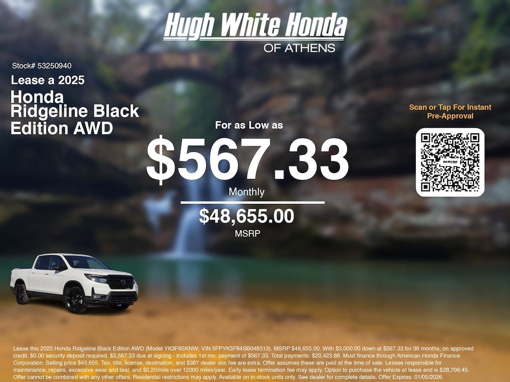 Disclaimer: Lease this 2025 Honda Ridgeline Black Edition AWD (Model YK3F8SKNW; VIN 5FPYK3F84SB048513). MSRP $48,655.00. With $3,000.00 down at $567.33 for 36 months, on approved credit. $0.00 security deposit required. $3,567.33 due at signing - includes 1st mo. payment of $567.33. Total payments: $20,423.88. Must finance through American Honda Finance Corporation. Selling price $45,655. Tax, title, license, destination, and $387 dealer doc fee are extra. Offer assumes these are paid at the time of sale. Lessee responsible for maintenance, repairs, excessive wear and tear, and $0.20/mile over 12000 miles/year. Early lease termination fee may apply. Option to purchase the vehicle at lease end is $28,706.45. Offer cannot be combined with any other offers. Residential restrictions may apply. Available on in-stock units only. See dealer for complete details. Offer Expires: 01/05/2026.
