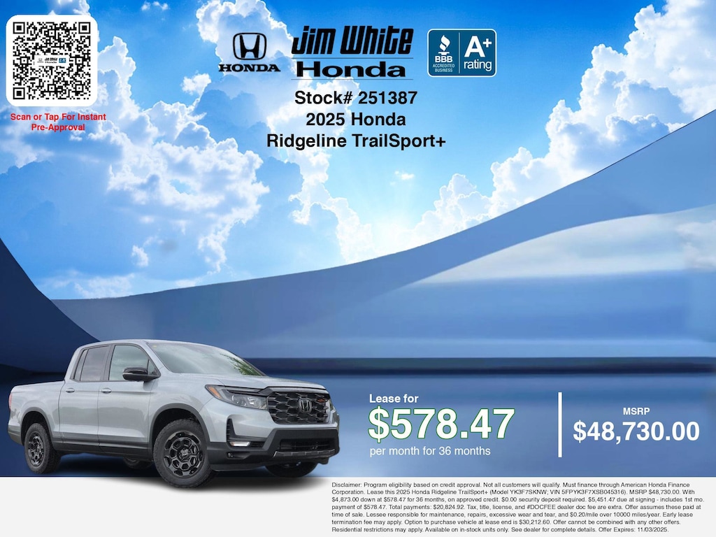 These offers leverage the benefits of Honda Financial Services, along with current Honda incentives, Honda Ridgeline TrailSport+ specials, and tax incentives available on electric vehicles. Additionally, we offer 1 other Ridgeline TrailSport+ options for the best selection in Maumee. Call or drive in for competitive Honda lease offers you can drive home today, like this stunning 2025 Honda Ridgeline with lease options near Maumee! This Ridgeline is also available for sale near Toledo, Perrysburg, and Waterville. These Honda lease specials end 11/3/2025 Disclaimer: Disclaimer: Program eligibility based on credit approval. Not all customers will qualify. Must finance through American Honda Finance Corporation. Lease this 2025 Honda Ridgeline TrailSport+ (Model YK3F7SKNW; VIN 5FPYK3F7XSB045316). MSRP $48,730.00. With $4,873.00 down at $578.47 for 36 months, on approved credit. $0.00 security deposit required. $5,451.47 due at signing - includes 1st mo. payment of $578.47. Total payments: $20,824.92. Tax, title, license, and #DOCFEE dealer doc fee are extra. Offer assumes these paid at time of sale. Lessee responsible for maintenance, repairs, excessive wear and tear, and $0.20/mile over 10000 miles/year. Early lease termination fee may apply. Option to purchase vehicle at lease end is $30,212.60. Offer cannot be combined with any other offers. Residential restrictions may apply. Available on in-stock units only. See dealer for complete details. Offer Expires: 11/03/2025.