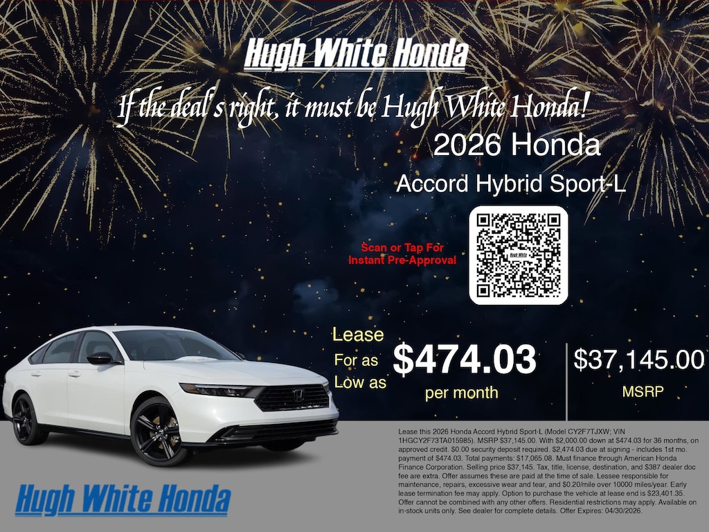 If the deal's right, it must be Hugh White! Stop in today and see why thousands of customers have trusted us with their new vehicles over the years! 2026 Honda Accord Hybrid Platinum White Pearl