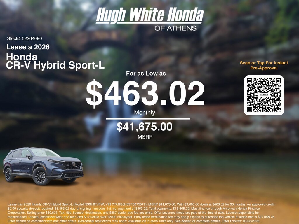 Disclaimer: Lease this 2026 Honda CR-V Hybrid Sport-L (Model RS6H8TJFW; VIN 7FARS6H89TE075577). MSRP $41,675.00. With $3,000.00 down at $463.02 for 36 months, on approved credit. $0.00 security deposit required. $3,463.02 due at signing - includes 1st mo. payment of $463.02. Total payments: $16,668.72. Must finance through American Honda Finance Corporation. Selling price $39,675. Tax, title, license, destination, and $387 dealer doc fee are extra. Offer assumes these are paid at the time of sale. Lessee responsible for maintenance, repairs, excessive wear and tear, and $0.20/mile over 12000 miles/year. Early lease termination fee may apply. Option to purchase the vehicle at lease end is $27,088.75. Offer cannot be combined with any other offers. Residential restrictions may apply. Available on in-stock units only. See dealer for complete details. Offer Expires: 03/03/2026.