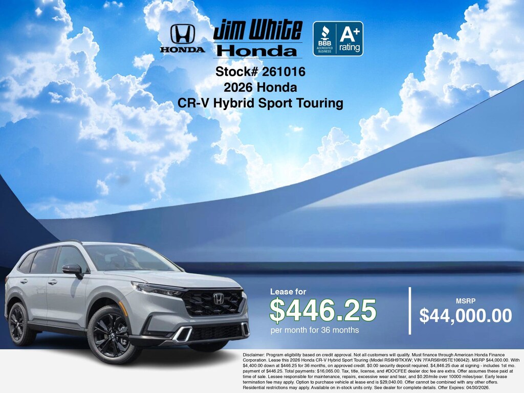 These offers leverage the benefits of Honda Financial Services, along with current Honda incentives, Honda CR-V Hybrid Sport Touring specials, and tax incentives available on electric vehicles. Additionally, we offer 5 other CR-V Hybrid Sport Touring options for the best selection in Maumee. Call or drive in for competitive Honda lease offers you can drive home today, like this stunning 2026 Honda CR-V Hybrid with lease options near Maumee! This CR-V Hybrid is also available for sale near Toledo, Perrysburg, and Waterville. These Honda lease specials end 4/30/2026 Disclaimer: Disclaimer: Program eligibility based on credit approval. Not all customers will qualify. Must finance through American Honda Finance Corporation. Lease this 2026 Honda CR-V Hybrid Sport Touring (Model RS6H9TKXW; VIN 7FARS6H95TE106042). MSRP $44,000.00. With $4,400.00 down at $446.25 for 36 months, on approved credit. $0.00 security deposit required. $4,846.25 due at signing - includes 1st mo. payment of $446.25. Total payments: $16,065.00. Tax, title, license, and #DOCFEE dealer doc fee are extra. Offer assumes these paid at time of sale. Lessee responsible for maintenance, repairs, excessive wear and tear, and $0.20/mile over 10000 miles/year. Early lease termination fee may apply. Option to purchase vehicle at lease end is $29,040.00. Offer cannot be combined with any other offers. Residential restrictions may apply. Available on in-stock units only. See dealer for complete details. Offer Expires: 04/30/2026.