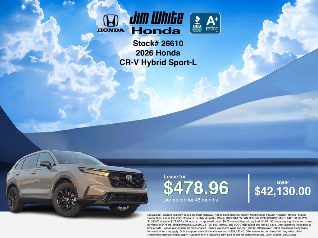 These offers leverage the benefits of Honda Financial Services, along with current Honda incentives, Honda CR-V Hybrid Sport-L specials, and tax incentives available on electric vehicles. Additionally, we offer 8 other CR-V Hybrid Sport-L options for the best selection in Maumee. Call or drive in for competitive Honda lease offers you can drive home today, like this stunning 2026 Honda CR-V Hybrid with lease options near Maumee! This CR-V Hybrid is also available for sale near Toledo, Perrysburg, and Waterville. These Honda lease specials end 3/3/2026 Disclaimer: Disclaimer: Program eligibility based on credit approval. Not all customers will qualify. Must finance through American Honda Finance Corporation. Lease this 2026 Honda CR-V Hybrid Sport-L (Model RS6H8TJFW; VIN 7FARS6H87TE078123). MSRP $42,130.00. With $4,213.00 down at $478.96 for 48 months, on approved credit. $0.00 security deposit required. $4,691.96 due at signing - includes 1st mo. payment of $478.96. Total payments: $22,990.08. Tax, title, license, and #DOCFEE dealer doc fee are extra. Offer assumes these paid at time of sale. Lessee responsible for maintenance, repairs, excessive wear and tear, and $0.20/mile over 10000 miles/year. Early lease termination fee may apply. Option to purchase vehicle at lease end is $24,435.40. Offer cannot be combined with any other offers. Residential restrictions may apply. Available on in-stock units only. See dealer for complete details. Offer Expires: 03/03/2026.