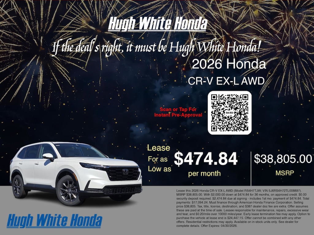 If the deal's right, it must be Hugh White! Stop in today and see why thousands of customers have trusted us with their new vehicles over the years! 2026 Honda CR-V Platinum White Pearl
