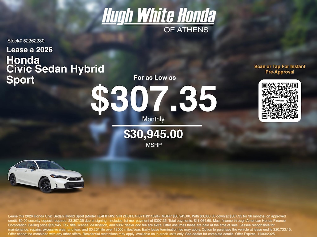 Disclaimer: Lease this 2026 Honda Civic Sedan Hybrid Sport (Model FE4F8TJW; VIN 2HGFE4F87TH311894). MSRP $30,945.00. With $3,000.00 down at $307.35 for 36 months, on approved credit. $0.00 security deposit required. $3,307.35 due at signing - includes 1st mo. payment of $307.35. Total payments: $11,064.60. Must finance through American Honda Finance Corporation. Selling price $29,945. Tax, title, license, destination, and $387 dealer doc fee are extra. Offer assumes these are paid at the time of sale. Lessee responsible for maintenance, repairs, excessive wear and tear, and $0.20/mile over 12000 miles/year. Early lease termination fee may apply. Option to purchase the vehicle at lease end is $20,733.15. Offer cannot be combined with any other offers. Residential restrictions may apply. Available on in-stock units only. See dealer for complete details. Offer Expires: 11/03/2025.