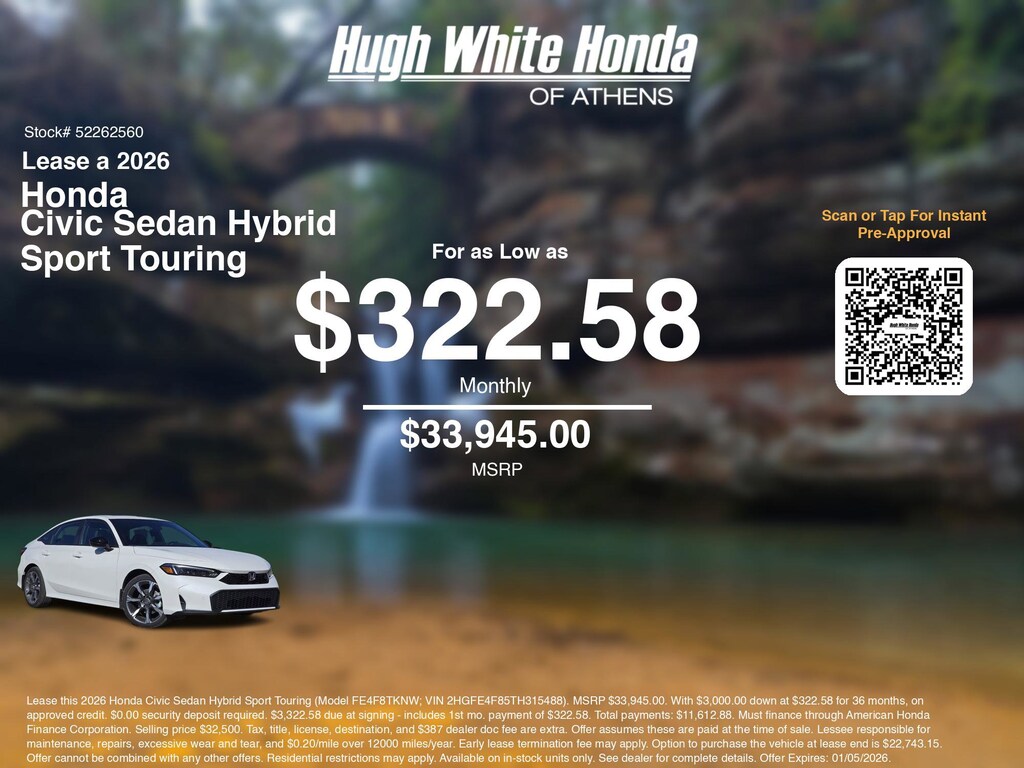 If you're ready to lease a new Honda near Athens, Nelsonville, Logan, and Parkersburg, Hugh White Honda of Athens is thrilled to offer you a competitive lease offer on this 2026 Honda Civic Sedan Hybrid Sport Touring. Here is how the monthly payment of $322.58 is calculated for well qualified buyers shopping Hugh White Honda of Athens with Tier 1 credit: