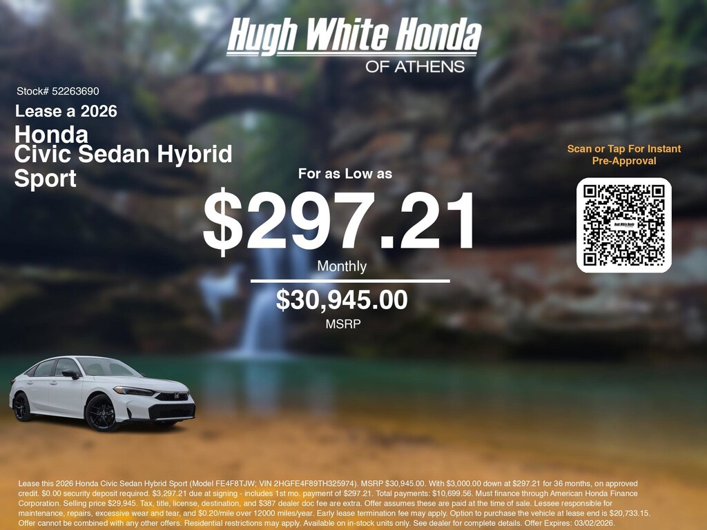 Disclaimer: Lease this 2026 Honda Civic Sedan Hybrid Sport (Model FE4F8TJW; VIN 2HGFE4F89TH325974). MSRP $30,945.00. With $3,000.00 down at $297.21 for 36 months, on approved credit. $0.00 security deposit required. $3,297.21 due at signing - includes 1st mo. payment of $297.21. Total payments: $10,699.56. Must finance through American Honda Finance Corporation. Selling price $29,945. Tax, title, license, destination, and $387 dealer doc fee are extra. Offer assumes these are paid at the time of sale. Lessee responsible for maintenance, repairs, excessive wear and tear, and $0.20/mile over 12000 miles/year. Early lease termination fee may apply. Option to purchase the vehicle at lease end is $20,733.15. Offer cannot be combined with any other offers. Residential restrictions may apply. Available on in-stock units only. See dealer for complete details. Offer Expires: 03/02/2026.