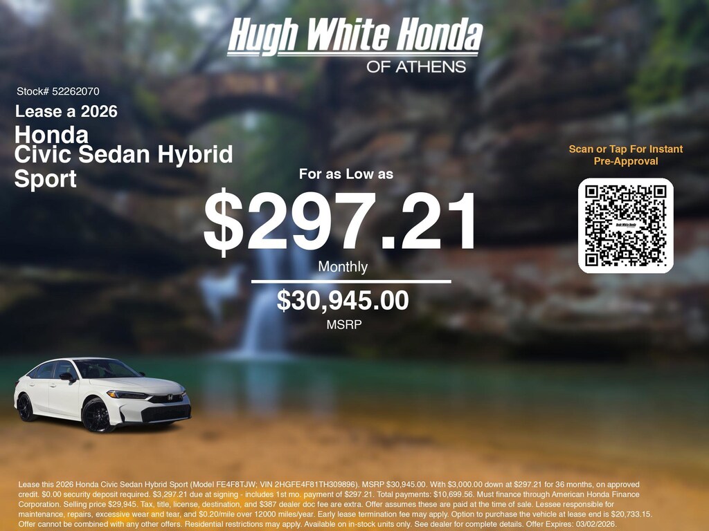 Disclaimer: Lease this 2026 Honda Civic Sedan Hybrid Sport (Model FE4F8TJW; VIN 2HGFE4F81TH309896). MSRP $30,945.00. With $3,000.00 down at $297.21 for 36 months, on approved credit. $0.00 security deposit required. $3,297.21 due at signing - includes 1st mo. payment of $297.21. Total payments: $10,699.56. Must finance through American Honda Finance Corporation. Selling price $29,945. Tax, title, license, destination, and $387 dealer doc fee are extra. Offer assumes these are paid at the time of sale. Lessee responsible for maintenance, repairs, excessive wear and tear, and $0.20/mile over 12000 miles/year. Early lease termination fee may apply. Option to purchase the vehicle at lease end is $20,733.15. Offer cannot be combined with any other offers. Residential restrictions may apply. Available on in-stock units only. See dealer for complete details. Offer Expires: 03/02/2026.