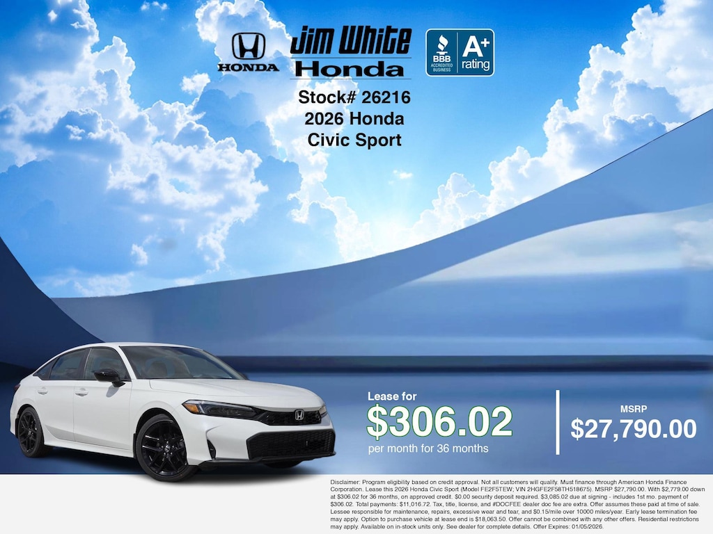 If you are looking to lease a car or explore car lease offers for a new Honda near Maumee, Toledo, Perrysburg, and Waterville, Jim White Honda is thrilled to offer you competitive car lease deals on this 2026 Honda Civic Sport. Here is how the monthly payment of $306.02 is calculated for well-qualified buyers shopping Jim White Honda with Tier 1 credit (use our car lease calculator or monthly car payment calculator for estimates):