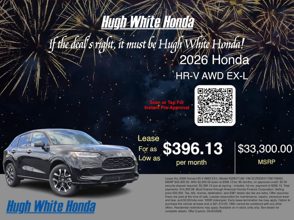 If the deal's right, it must be Hugh White! Stop in today and see why thousands of customers have trusted us with their new vehicles over the years! 2026 Honda HR-V Crystal Black Pearl