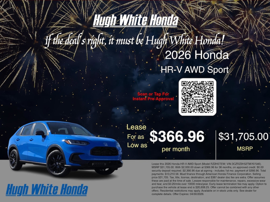If the deal's right, it must be Hugh White! Stop in today and see why thousands of customers have trusted us with their new vehicles over the years! 2026 Honda HR-V Boost Blue Pearl