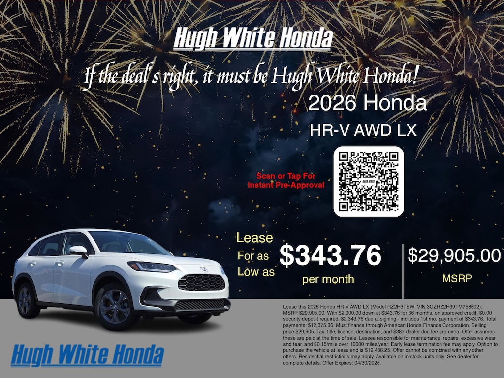 If the deal's right, it must be Hugh White! Stop in today and see why thousands of customers have trusted us with their new vehicles over the years! 2026 Honda HR-V Platinum White Pearl