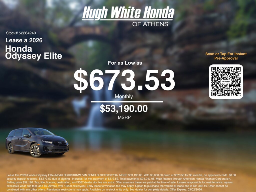 Disclaimer: Lease this 2026 Honda Odyssey Elite (Model RL6H9TKNW; VIN 5FNRL6H9XTB033730). MSRP $53,190.00. With $3,000.00 down at $673.53 for 36 months, on approved credit. $0.00 security deposit required. $3,673.53 due at signing - includes 1st mo. payment of $673.53. Total payments: $24,247.08. Must finance through American Honda Finance Corporation. Selling price $52,190. Tax, title, license, destination, and $387 dealer doc fee are extra. Offer assumes these are paid at the time of sale. Lessee responsible for maintenance, repairs, excessive wear and tear, and $0.20/mile over 12000 miles/year. Early lease termination fee may apply. Option to purchase the vehicle at lease end is $31,382.10. Offer cannot be combined with any other offers. Residential restrictions may apply. Available on in-stock units only. See dealer for complete details. Offer Expires: 03/02/2026.