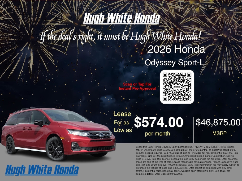 If the deal's right, it must be Hugh White! Stop in today and see why thousands of customers have trusted us with their new vehicles over the years! 2026 Honda Odyssey Radiant Red Metallic II