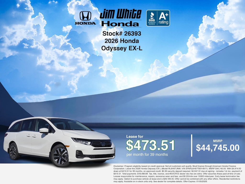 These offers leverage the benefits of Honda Financial Services, along with current Honda incentives, Honda Odyssey EX-L specials, and tax incentives available on electric vehicles. Additionally, we offer 13 other Odyssey EX-L options for the best selection in Maumee. Call or drive in for competitive Honda lease offers you can drive home today, like this stunning 2026 Honda Odyssey with lease options near Maumee! This Odyssey is also available for sale near Toledo, Perrysburg, and Waterville. These Honda lease specials end 1/5/2026 Disclaimer: Disclaimer: Program eligibility based on credit approval. Not all customers will qualify. Must finance through American Honda Finance Corporation. Lease this 2026 Honda Odyssey EX-L (Model RL6H6TJNW; VIN 5FNRL6H67TB014977). MSRP $44,745.00. With $4,474.00 down at $473.51 for 39 months, on approved credit. $0.00 security deposit required. $4,947.51 due at signing - includes 1st mo. payment of $473.51. Total payments: $18,466.89. Tax, title, license, and #DOCFEE dealer doc fee are extra. Offer assumes these paid at time of sale. Lessee responsible for maintenance, repairs, excessive wear and tear, and $0.20/mile over 10000 miles/year. Early lease termination fee may apply. Option to purchase vehicle at lease end is $28,189.35. Offer cannot be combined with any other offers. Residential restrictions may apply. Available on in-stock units only. See dealer for complete details. Offer Expires: 01/05/2026.