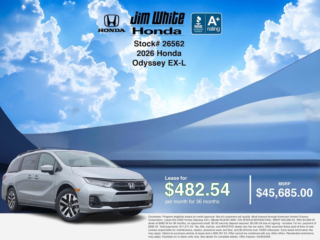 These offers leverage the benefits of Honda Financial Services, along with current Honda incentives, Honda Odyssey EX-L specials, and tax incentives available on electric vehicles. Additionally, we offer 3 other Odyssey EX-L options for the best selection in Maumee. Call or drive in for competitive Honda lease offers you can drive home today, like this stunning 2026 Honda Odyssey with lease options near Maumee! This Odyssey is also available for sale near Toledo, Perrysburg, and Waterville. These Honda lease specials end 4/30/2026 Disclaimer: Disclaimer: Program eligibility based on credit approval. Not all customers will qualify. Must finance through American Honda Finance Corporation. Lease this 2026 Honda Odyssey EX-L (Model RL6H6TJNW; VIN 5FNRL6H60TB027005). MSRP $45,685.00. With $4,568.00 down at $482.54 for 36 months, on approved credit. $0.00 security deposit required. $5,050.54 due at signing - includes 1st mo. payment of $482.54. Total payments: $17,371.44. Tax, title, license, and #DOCFEE dealer doc fee are extra. Offer assumes these paid at time of sale. Lessee responsible for maintenance, repairs, excessive wear and tear, and $0.20/mile over 10000 miles/year. Early lease termination fee may apply. Option to purchase vehicle at lease end is $28,781.55. Offer cannot be combined with any other offers. Residential restrictions may apply. Available on in-stock units only. See dealer for complete details. Offer Expires: 04/30/2026.