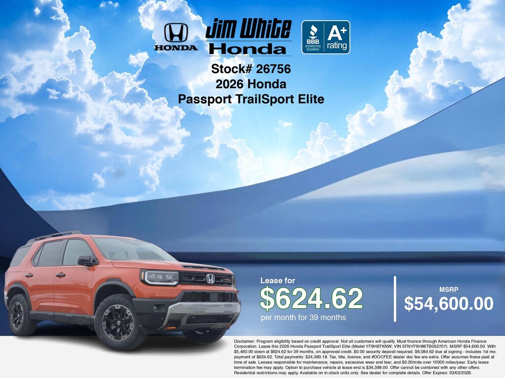 These offers leverage the benefits of Honda Financial Services, along with current Honda incentives, Honda Passport TrailSport Elite specials, and tax incentives available on electric vehicles. Additionally, we offer 9 other Passport TrailSport Elite options for the best selection in Maumee. Call or drive in for competitive Honda lease offers you can drive home today, like this stunning 2026 Honda Passport with lease options near Maumee! This Passport is also available for sale near Toledo, Perrysburg, and Waterville. These Honda lease specials end 3/2/2026 Disclaimer: Disclaimer: Program eligibility based on credit approval. Not all customers will qualify. Must finance through American Honda Finance Corporation. Lease this 2026 Honda Passport TrailSport Elite (Model YF9H8TKNW; VIN 5FNYF9H86TB052707). MSRP $54,600.00. With $5,460.00 down at $624.62 for 39 months, on approved credit. $0.00 security deposit required. $6,084.62 due at signing - includes 1st mo. payment of $624.62. Total payments: $24,360.18. Tax, title, license, and #DOCFEE dealer doc fee are extra. Offer assumes these paid at time of sale. Lessee responsible for maintenance, repairs, excessive wear and tear, and $0.20/mile over 10000 miles/year. Early lease termination fee may apply. Option to purchase vehicle at lease end is $34,398.00. Offer cannot be combined with any other offers. Residential restrictions may apply. Available on in-stock units only. See dealer for complete details. Offer Expires: 03/02/2026.