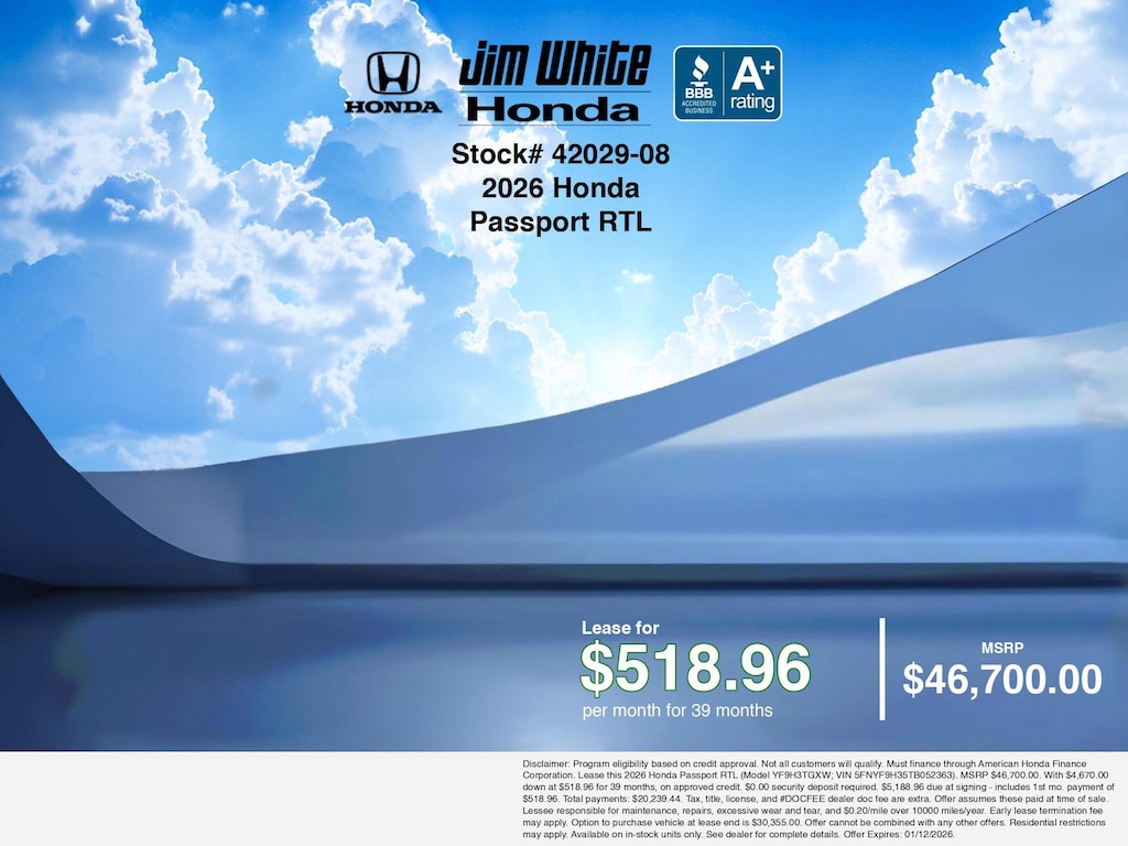 These offers leverage the benefits of Honda Financial Services, along with current Honda incentives, Honda Passport RTL specials, and tax incentives available on electric vehicles. Additionally, we offer 1 other Passport RTL options for the best selection in Maumee. Call or drive in for competitive Honda lease offers you can drive home today, like this stunning 2026 Honda Passport with lease options near Maumee! This Passport is also available for sale near Toledo, Perrysburg, and Waterville. These Honda lease specials end 1/12/2026 Disclaimer: Disclaimer: Program eligibility based on credit approval. Not all customers will qualify. Must finance through American Honda Finance Corporation. Lease this 2026 Honda Passport RTL (Model YF9H3TGXW; VIN 5FNYF9H35TB052363). MSRP $46,700.00. With $4,670.00 down at $518.96 for 39 months, on approved credit. $0.00 security deposit required. $5,188.96 due at signing - includes 1st mo. payment of $518.96. Total payments: $20,239.44. Tax, title, license, and #DOCFEE dealer doc fee are extra. Offer assumes these paid at time of sale. Lessee responsible for maintenance, repairs, excessive wear and tear, and $0.20/mile over 10000 miles/year. Early lease termination fee may apply. Option to purchase vehicle at lease end is $30,355.00. Offer cannot be combined with any other offers. Residential restrictions may apply. Available on in-stock units only. See dealer for complete details. Offer Expires: 01/12/2026.